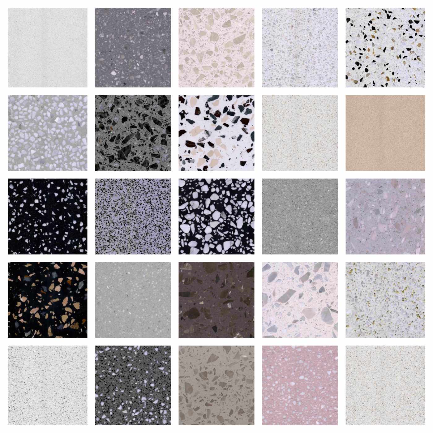 Material da pedra Terrazzo | Agregados, pigmentos, pedra britada, vidro, pedra de quartzo, etc., com material aglomerante de cimento para produzir um produto de concreto. | ||