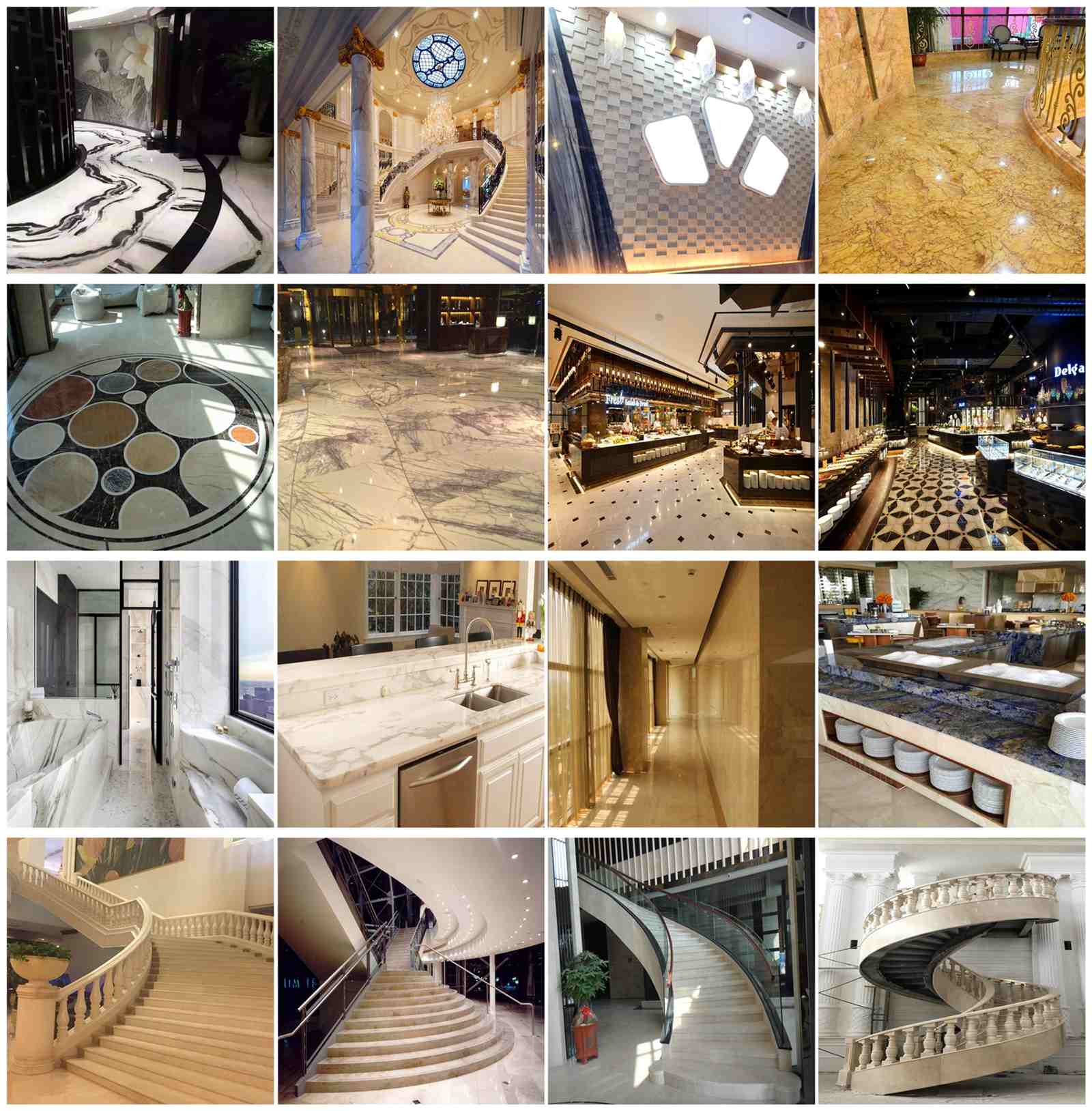 Aplicação de produtos acabados | Placas, ladrilhos, rodapés, peitoris de janelas, degraus e contra-degraus, bancadas de cozinha, tampos de banheiro, bancadas de trabalho, colunas, meio-fios, pedras de pavimentação, cubos, mosaicos e bordas, esculturas e outros usos internos. | |