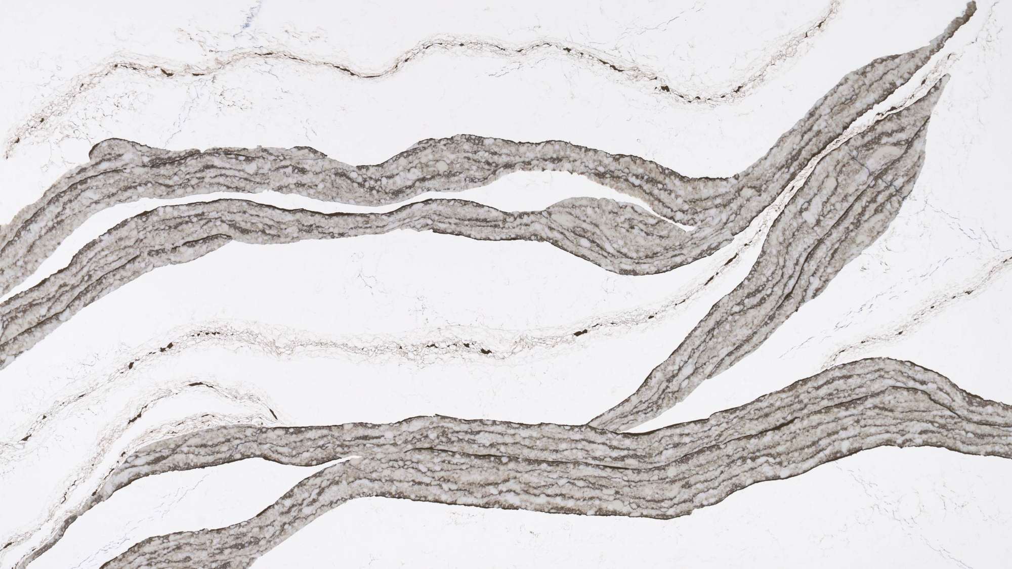As bancadas de pedra artificial Pristine Organic Mountain Quartz são compostas por uma base de quartzo branca com veios marcantes em tons de cinza claro que se estendem por toda a sua superfície. A combinação perfeita entre veios marcantes e finos proporciona a sensação de movimento das montanhas.