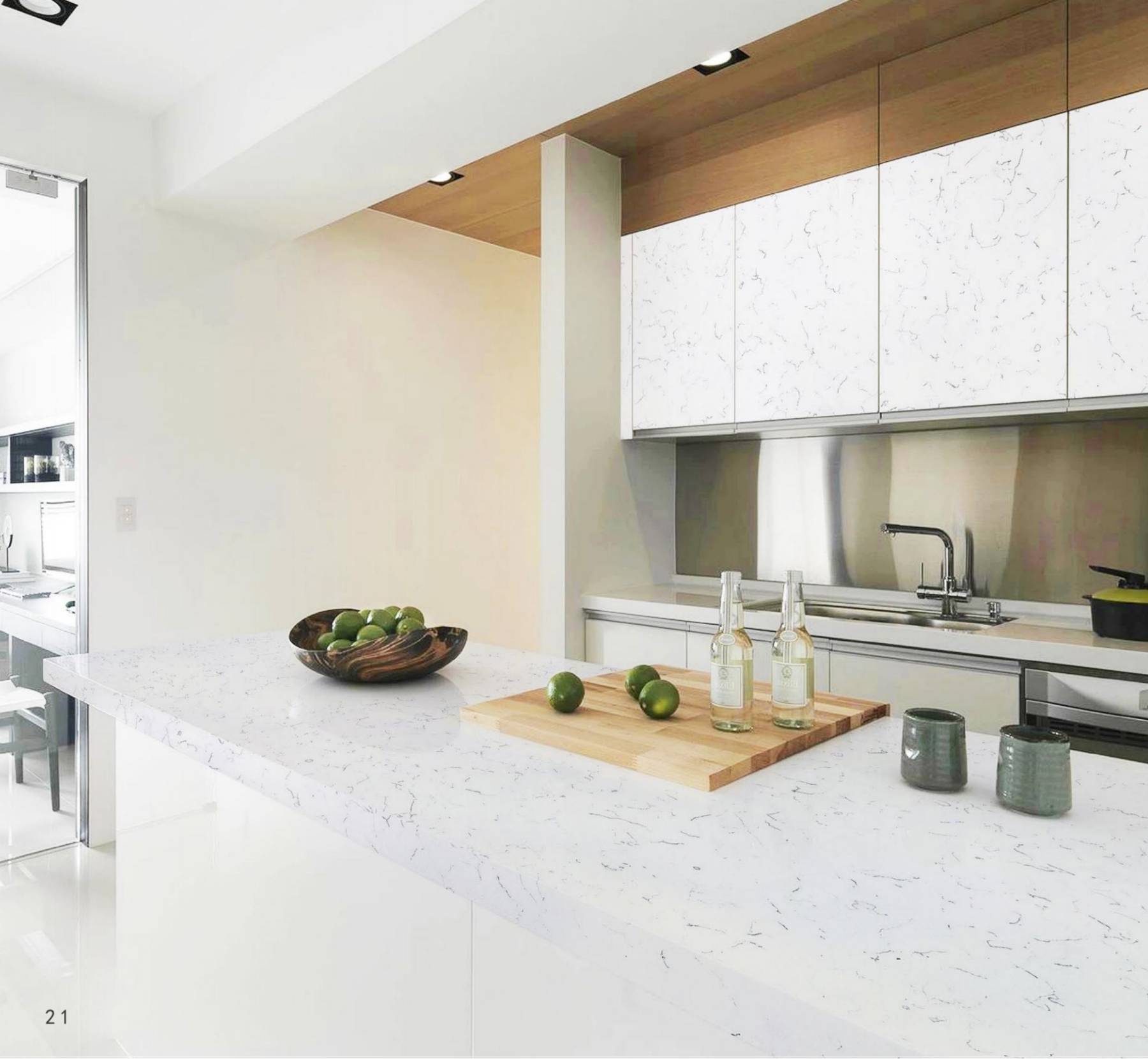 Pó de quartzo natural de alta pureza (93%), mais 7% de resina epóxi ou outras partículas decorativas.