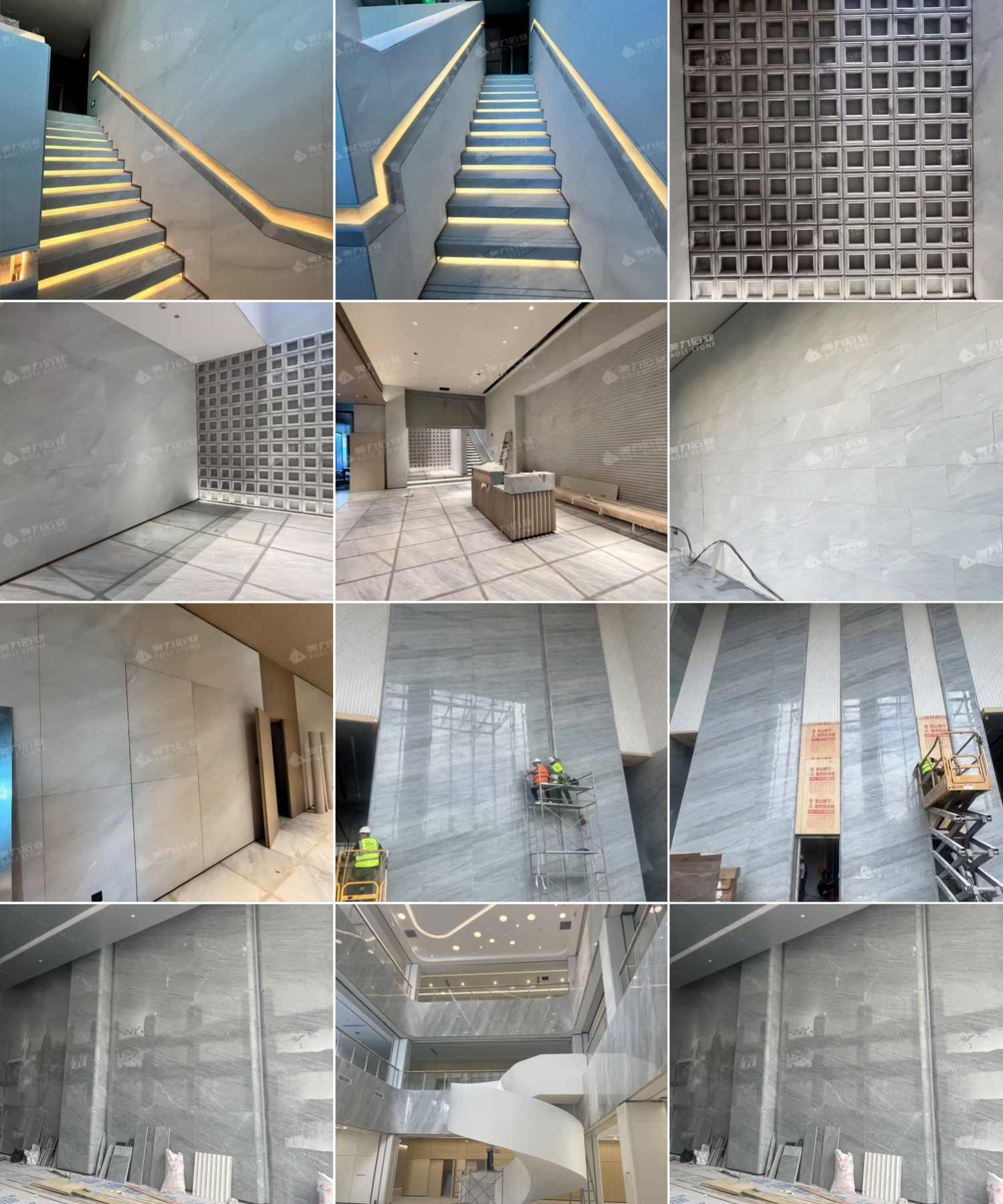 Na Aolistone, o mármore Stratus Grey é processado através de um fluxo de trabalho controlado e profissional. Cada bloco passa por uma rigorosa seleção visual e estrutural antes do corte. As placas são reforçadas com uma tela de fibra de vidro padrão para aumentar a estabilidade. O acabamento da superfície inclui polimento fino de 100 mesh, proporcionando uma superfície lisa e reflexiva que realça os veios naturais, mantendo a elegância tátil. Cada placa é calibrada, tem as bordas verificadas e passa por inspeção de qualidade antes do embalamento.