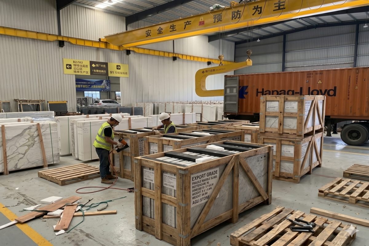 Um pedido de mármore pode estar correto em termos de material e ainda assim causar problemas se a embalagem for frágil, pouco clara ou mal organizada para descarregar e identificar as peças. Para compradores de placas, especialmente em remessas de contêineres, a estrutura da caixa nunca deve ser uma consideração secundária.